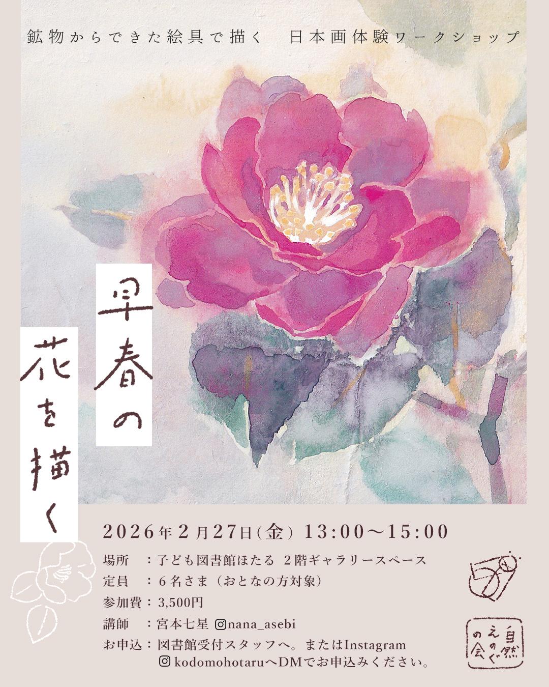 この時期に里山に咲いている早春の花をモチーフに、色がにじむ美しさや、岩絵具ならではの質感を感じながら、ここちのいい色彩を麻紙にのせていきます。
